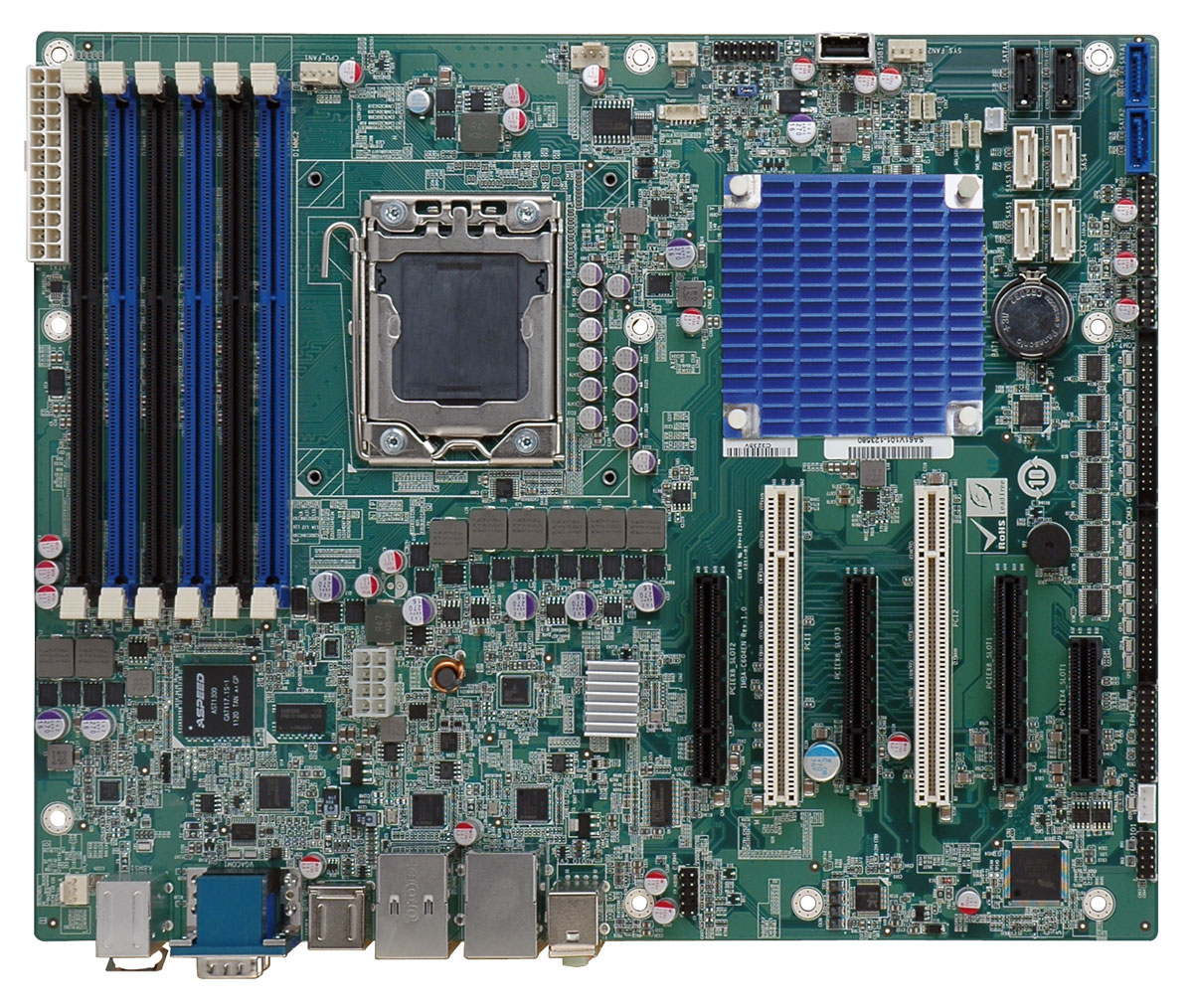 Absolut ungewöhnlich für ein Server Mainboard sind die Schnittstellen, vor allem die 9 (!) RS232 Ports dürfte man sonst auf keinem Server Board finden. Die maximal verfügbaren 24 PCI-Express 3.0 Lanes können auf 3x PCI-E x8 und einen PCI-E x4 Slot verteilt werden. Zwei konventionelle PCI Slots stehen ebenfalls zur Verfügung, diese im Serverbereich praktisch ausgestorbenen Slots finden in der Industrie noch vielfach Verwendung. Der Intel Intel® C604 Chipsatz (Intel® BD82C604 PCH) verfügt neben 4x SATA Ports auch über 4x 3GBit/s SAS Ports. Erstere bieten RAID0/1/10 & 5, letztere nur RAID 0/1 & 10. Das nur zwei der SATA Ports 6GBit/S unterstützen dürfte in einem „echten“ Server Umfeld bei Einsatz schneller SSDs stören, im Industriebereich, wo selten große Disk Arrays im eine Rolle spielen, eher nicht.